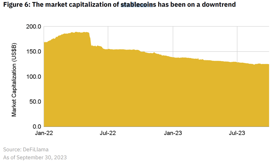 Trích dẫn phân tích on-chain trên nền tảng theo dõi giá blockchain DeFiLlama, Binance Research giải thích rằng tháng vừa qua đã chứng kiến mức thấp nhất mọi thời đại mới, khiến vốn hóa thị trường của stablecoin trượt xuống 123,8 tỷ USD, mức thấp nhất kể từ tháng 9 năm 2021.