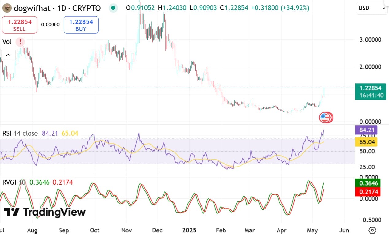 Trong vòng một tuần, giá dogwifhat (WIF) đã tăng vọt 127%, từ đáy $0,53 lên tới $1,27 — mức cao nhất trong 4 tháng và tăng 42,9% chỉ trong 24 giờ qua. Đợt tăng giá này cũng đánh dấu sự bứt phá khỏi xu hướng giảm kéo dài suốt 5 tháng.