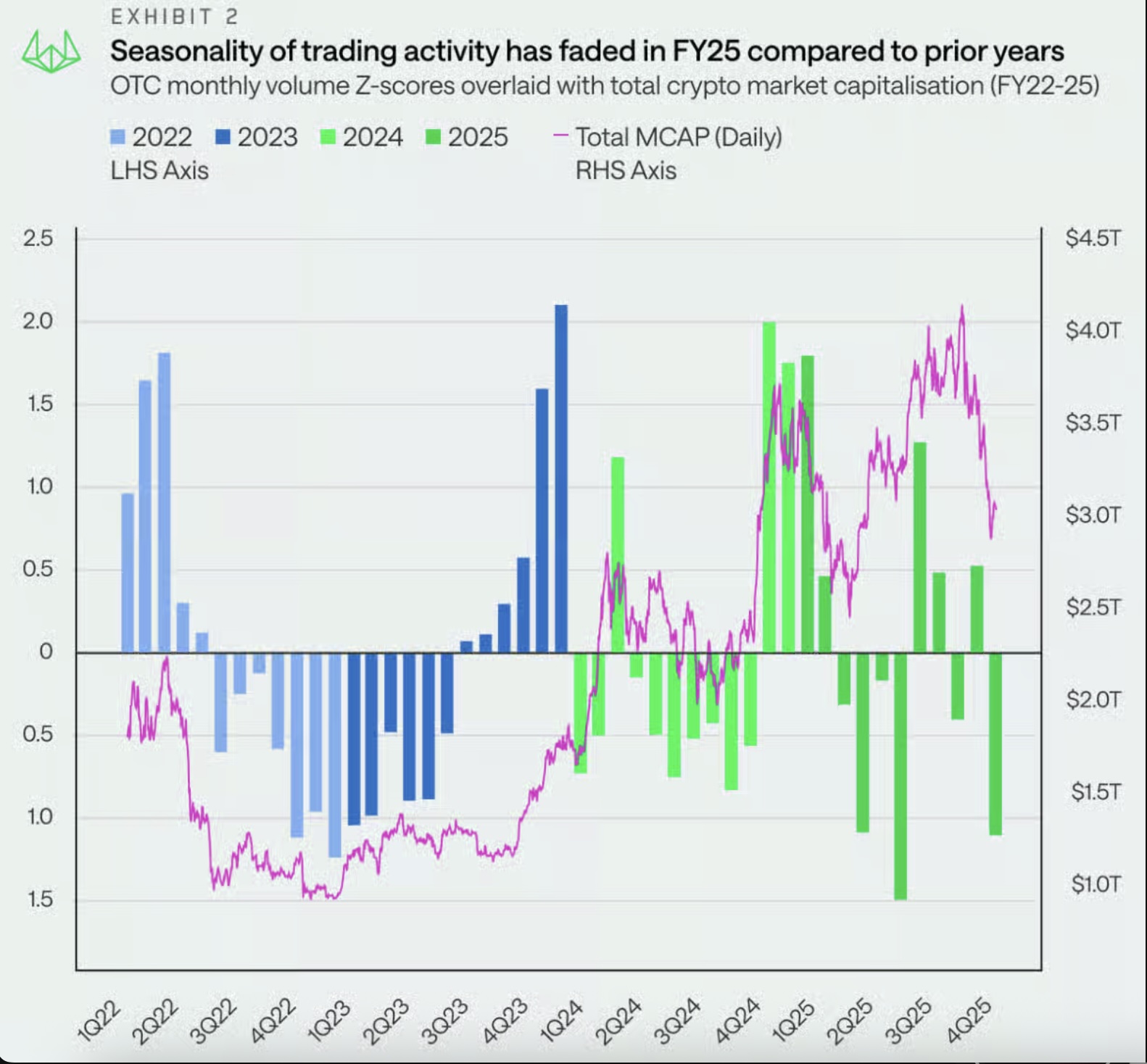 “Vốn không còn lan tỏa trên diện rộng toàn thị trường,” Wintermute nhận định trong báo cáo OTC tài sản số năm 2025, được xây dựng dựa trên dữ liệu giao dịch OTC độc quyền của công ty.