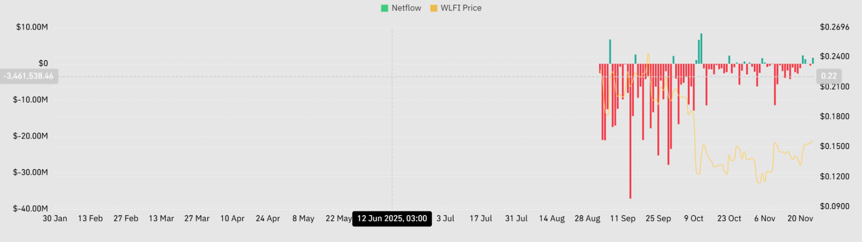 Mặt khác, Spot Netflow vừa chuyển sang dương, cho thấy áp lực bán đang gia tăng. Dữ liệu từ CoinGlass cho thấy Netflow dương 1,66 triệu USD, so với mức –500.000 USD của ngày trước đó. Nếu áp lực bán tiếp tục gia tăng, WLFI có thể sẽ quay lại kiểm tra đường EMA 20 ngày quanh 0,1439 USD.