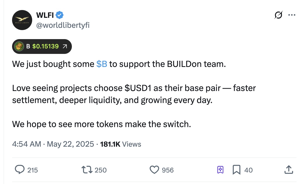 World Liberty Financial thông báo đã mua token BUILDon (B) nhằm hỗ trợ đội ngũ phát triển dự án. Đồng thời, tổ chức kêu gọi nhiều dự án khác lựa chọn USD1 làm cặp giao dịch cơ sở, với lý do mang lại thanh khoản sâu hơn, tốc độ thanh toán nhanh và hệ sinh thái ngày càng phát triển.