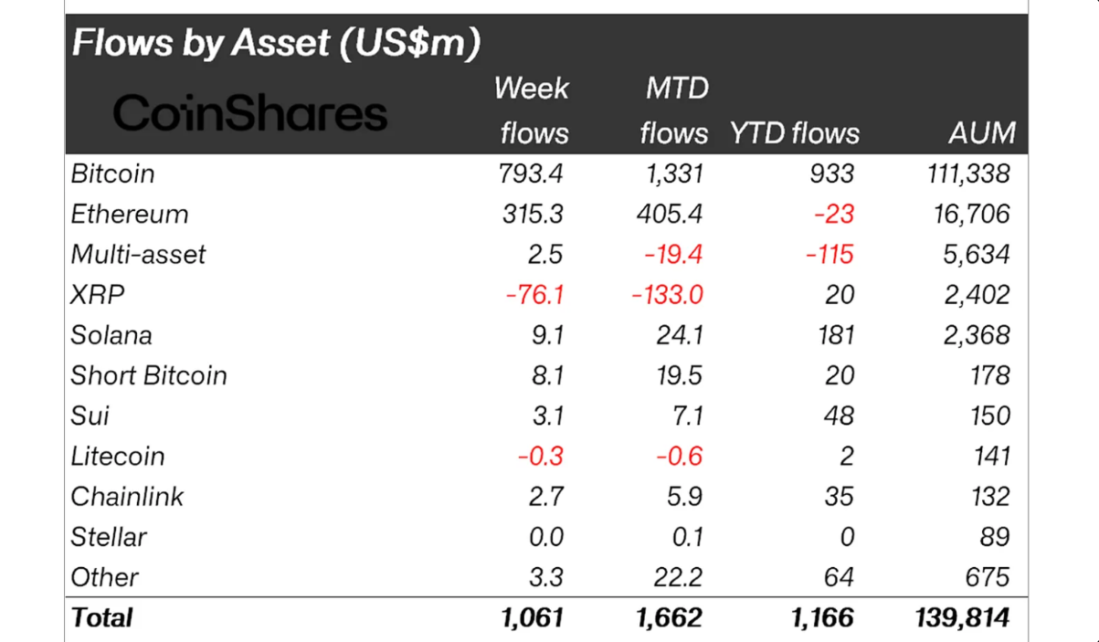 Dòng tiền theo loại tài sản | Nguồn: CoinShares