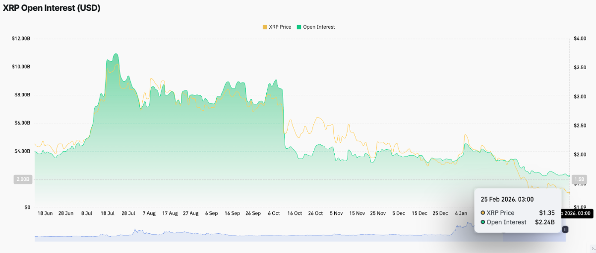 Trái ngược với tín hiệu tích cực từ thị trường ETF, mảng phái sinh vẫn chưa thoát khỏi xu hướng suy yếu. Hợp đồng mở (OI) của hợp đồng tương lai giảm xuống còn 2,24 tỷ USD vào thứ Năm, từ mức 2,29 tỷ USD của ngày trước đó. Đáng chú ý, OI đã liên tục đi xuống kể từ đỉnh lịch sử 10,94 tỷ USD ghi nhận vào tháng 7 — thời điểm trùng với mức giá cao nhất mọi thời đại 3,66 USD — phản ánh sự sụt giảm rõ rệt trong mức độ quan tâm của nhà đầu tư cá nhân đối với token chuyển tiền này.