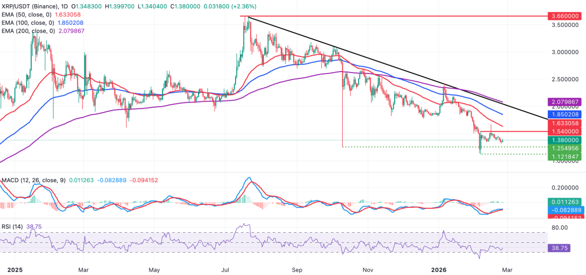 XRP hiện dao động quanh mốc 1,40 USD trong bối cảnh thị trường đang chứng kiến một nhịp hồi kỹ thuật mang tính hiệu chỉnh. Mặc dù giá đã phục hồi nhẹ từ mức mở cửa 1,35 USD, đồng coin này vẫn chịu áp lực rõ rệt khi tiếp tục giao dịch bên dưới các đường trung bình động hàm mũ (EMA) 50, 100 và 200 ngày — những ngưỡng đang đồng loạt dốc xuống và đóng vai trò như “trần” kìm hãm mọi nỗ lực tăng giá.