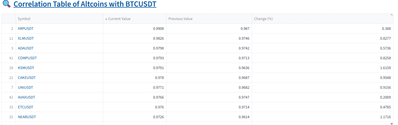 Ripple là minh chứng rõ nét cho xu hướng này. Dù ghi nhận dòng vốn vào tương đối tích cực, giá XRP vẫn khó thoát khỏi cái bóng của Bitcoin. Trên thực tế, dữ liệu biểu đồ cho thấy XRP đang dẫn đầu thị trường về mức độ phụ thuộc vào BTC, với hệ số tương quan lên tới 0,998 — cao nhất trong nhóm altcoin.