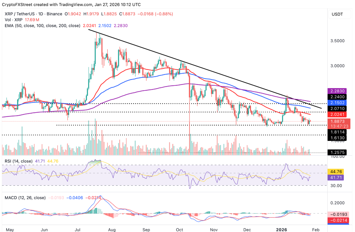 Dù vậy, khả năng ổn định và nối lại nhịp hồi phục của XRP vẫn được giữ ngỏ nếu giá bứt phá thuyết phục lên trên ngưỡng kháng cự gần 1,90 USD. Tuy nhiên, triển vọng tăng chỉ thực sự được củng cố khi XRP vượt qua cụm kháng cự nguồn cung mạnh nằm giữa EMA 50 ngày tại 2,02 USD và EMA 200 ngày tại 2,38 USD — vùng giá đòi hỏi sự thận trọng cao từ phía nhà đầu tư.
