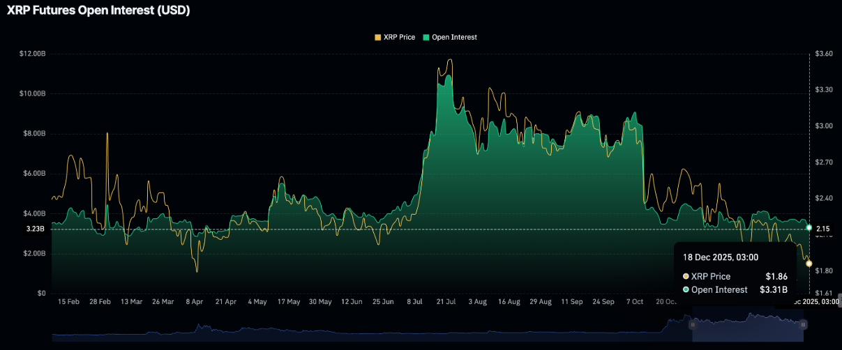 XRP đang đối mặt với sự suy giảm rõ rệt về mức độ quan tâm từ nhà đầu tư cá nhân, kéo theo những tác động tiêu cực lên thị trường phái sinh và làm gia tăng tần suất các đợt bán tháo trên diện rộng. Dữ liệu từ CoinGlass cho thấy hợp đồng mở (OI) của hợp đồng tương lai XRP chỉ đạt 3,31 tỷ USD vào thứ Năm, giảm mạnh so với 3,52 tỷ USD của ngày trước đó và 3,71 tỷ USD vào đầu tuần.