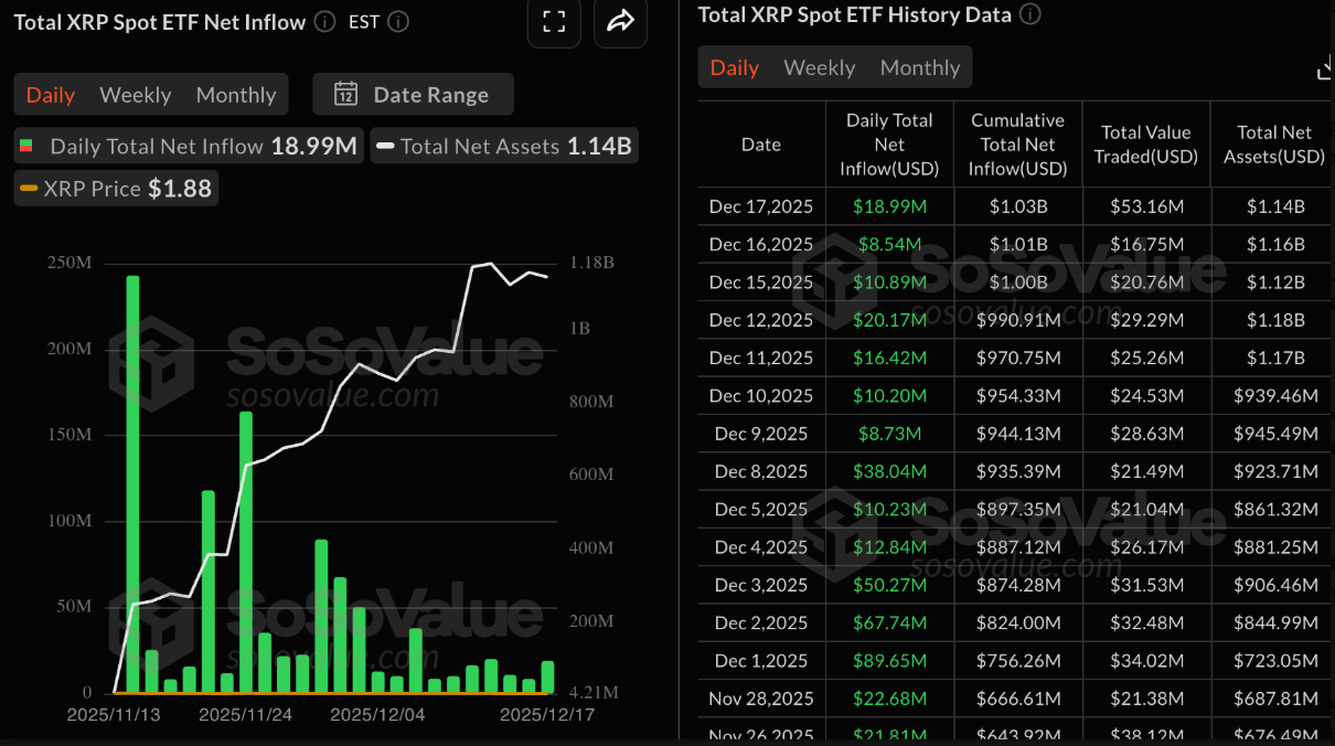 Cụ thể, các ETF XRP ghi nhận khoảng 18 triệu USD dòng tiền vào trong ngày thứ Tư, tăng mạnh so với mức 8,5 triệu USD của ngày thứ Ba. Theo dữ liệu từ SoSoValue, tổng dòng vốn ròng tích lũy hiện đã đạt 1,03 tỷ USD, trong khi tổng tài sản ròng quản lý lên tới 1,14 tỷ USD.
