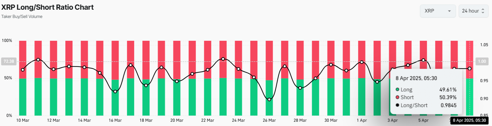 Cụ thể, tại thời điểm viết bài, tỷ lệ Long/Short của XRP đạt mức 0,98, cho thấy phe bán đang chiếm ưu thế trên thị trường. Bên cạnh đó, số lượng vị thế Short cũng đang áp đảo so với các lệnh Long, phản ánh niềm tin giảm giá vẫn đang chi phối tâm lý của phần lớn nhà đầu tư.