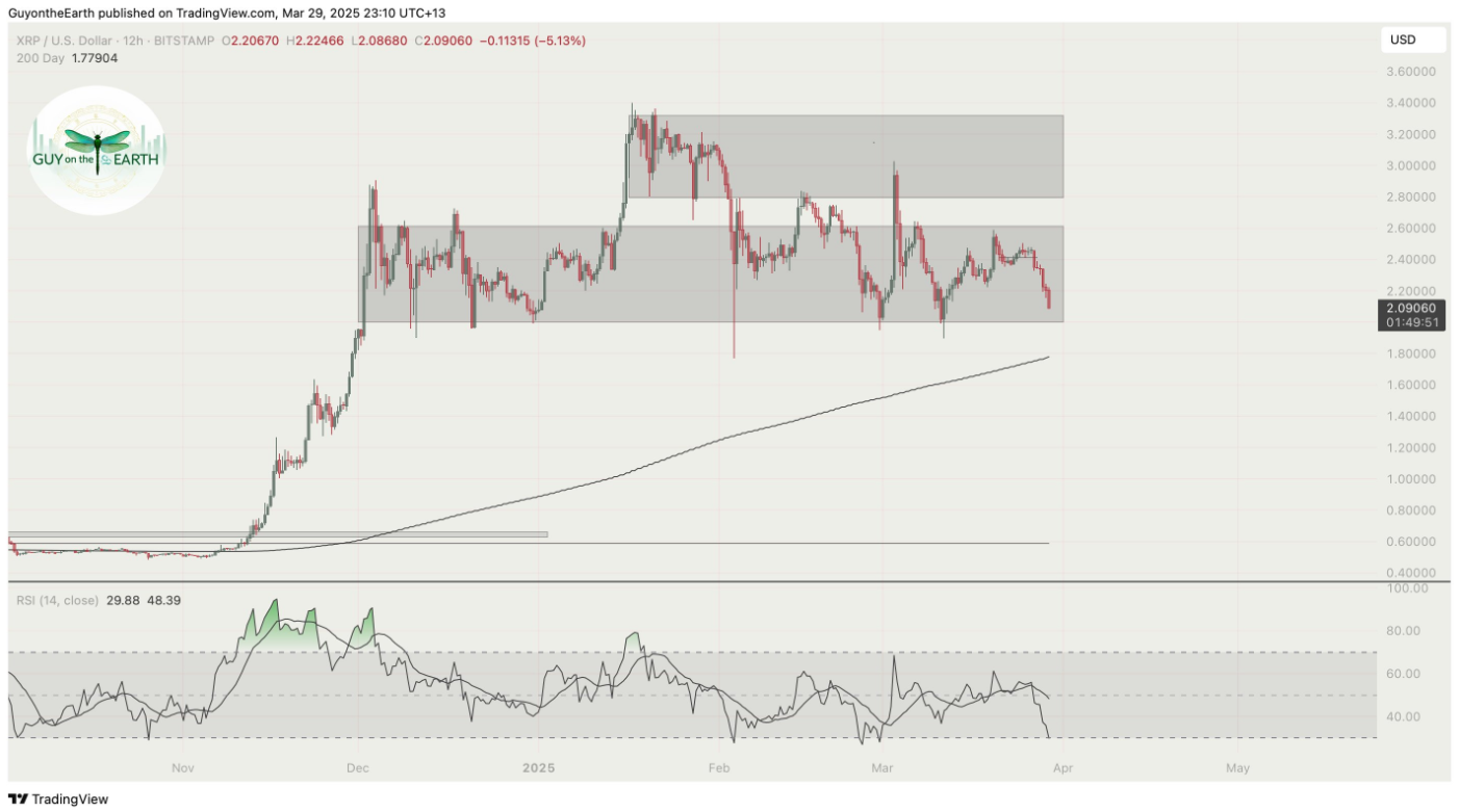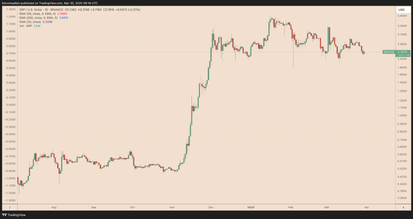 XRP đã giảm gần 40%, xuống còn khoảng $2,19, chỉ hai tháng sau khi chạm đỉnh nhiều năm tại $3,40. Tiền điện tử này chịu áp lực bán tháo cùng toàn thị trường, phần lớn do ảnh hưởng từ cuộc chiến thương mại dưới thời Tổng thống Donald Trump, bất chấp những tin tức tích cực như việc Ủy ban Giao dịch và Chứng khoán Hoa Kỳ (SEC) rút đơn kiện chống lại Ripple.