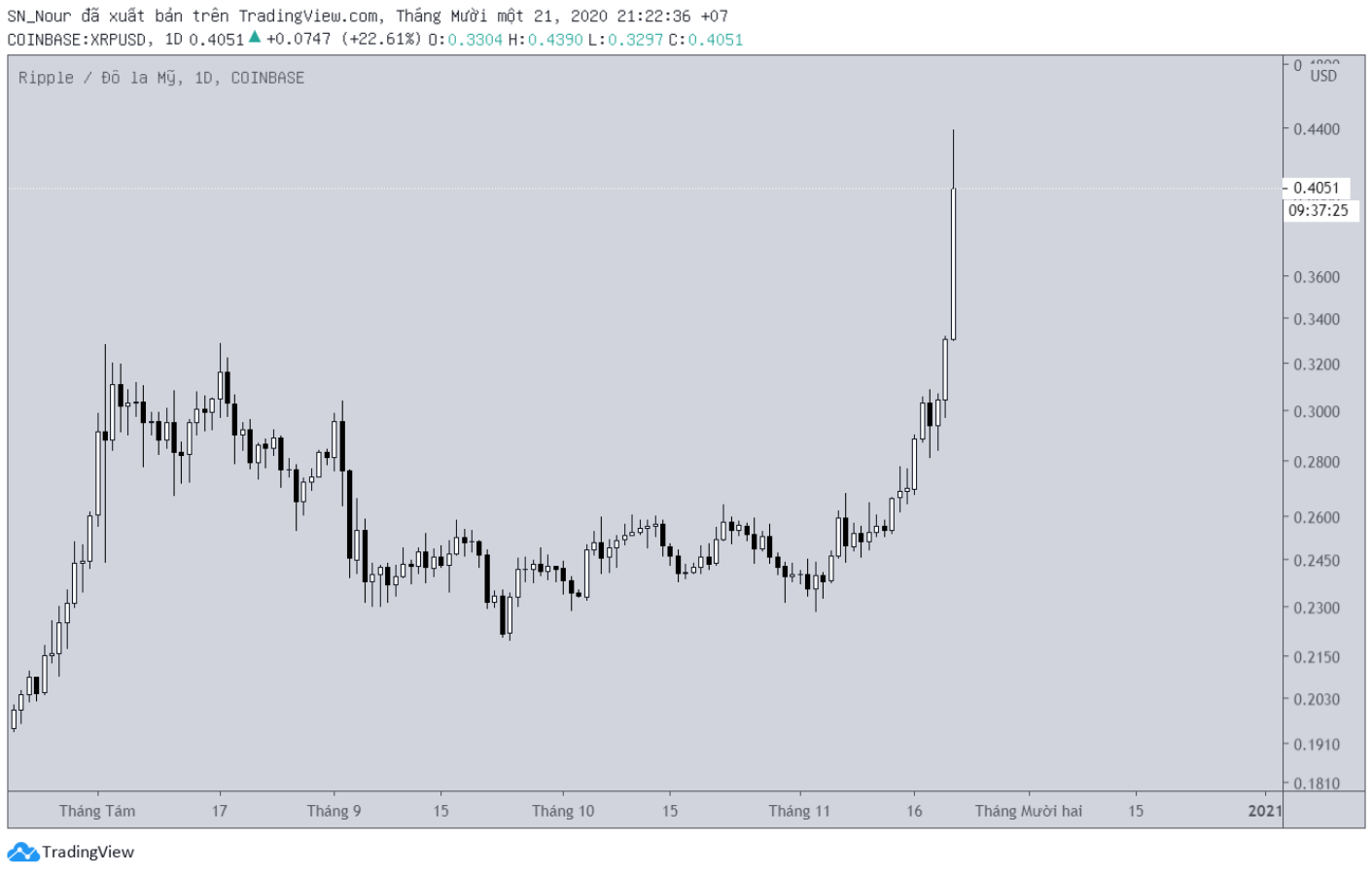 XRP, tiền điện tử lớn thứ tư với vốn hóa thị trường là 16,68 tỷ đô la, hôm nay đã đạt $ 0,4, mức giá cao nhất kể từ tháng 7 năm ngoái. Con số này được tăng từ mức $ 0,286 của một ngày trước, tăng 30%.