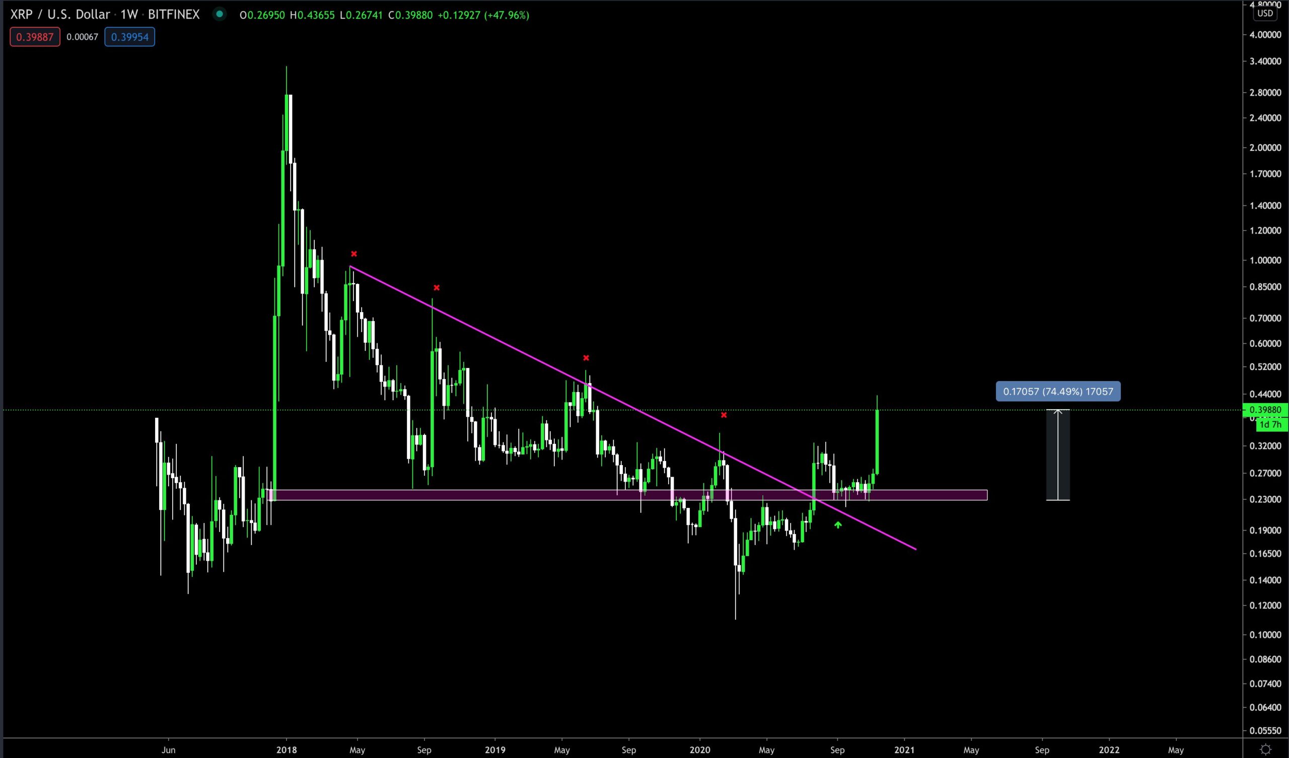 MacroCRG, một nhà giao dịch nổi tiếng trên Twitter cho biết vào tháng 9 rằng anh đã “all-in” XRP ở mức 0,24 đô la, hôm nay anh ấy đã tweet lại biểu đồ XRP đã chia sẻ và cập nhật của mình “to the moon”.