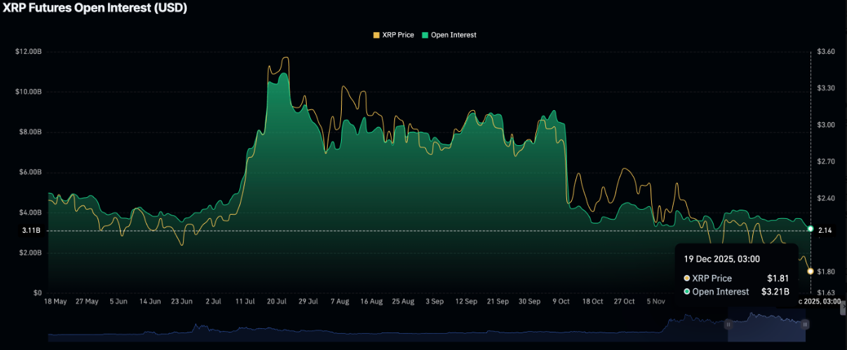 Ở chiều ngược lại, XRP đang chứng kiến sự suy giảm rõ rệt trong mức độ quan tâm của nhà đầu tư nhỏ lẻ, yếu tố đang tạo áp lực tiêu cực lên thị trường phái sinh và góp phần kích hoạt các đợt bán tháo lặp lại trên diện rộng. Dữ liệu từ CoinGlass cho thấy hợp đồng mở (OI) của hợp đồng tương lai XRP chỉ đạt 3,21 tỷ USD vào thứ Sáu, giảm so với 3,31 tỷ USD của ngày trước đó và 3,52 tỷ USD vào thứ Tư.