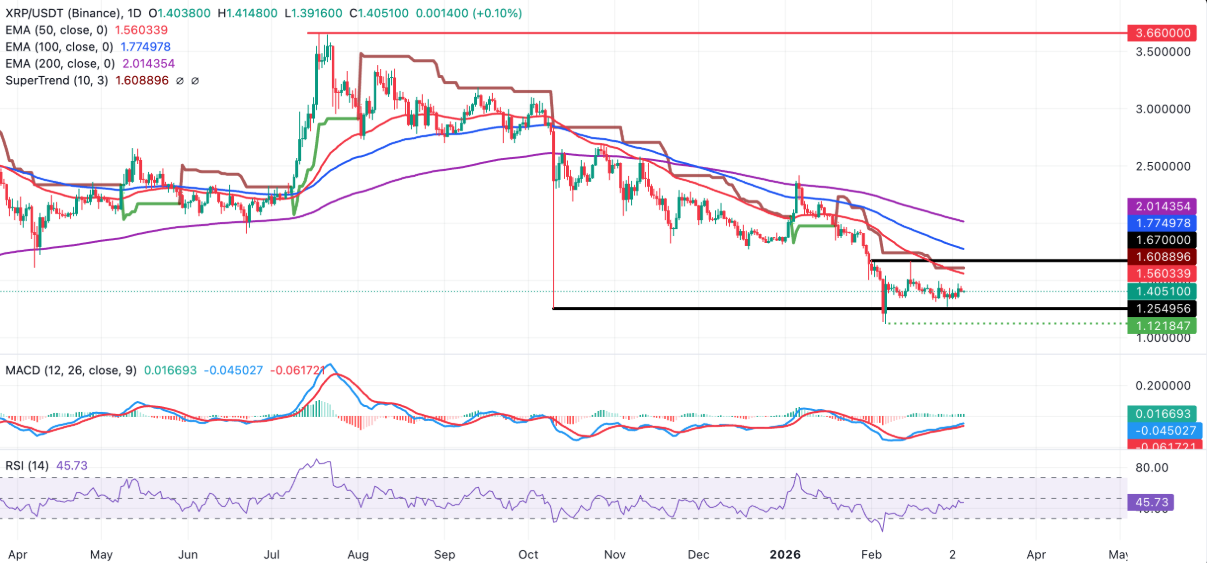 XRP hiện đang dao động trong biên độ hẹp từ 1,25 USD đến 1,67 USD, với vùng hỗ trợ gần nhất được hình thành quanh mốc 1,40 USD.