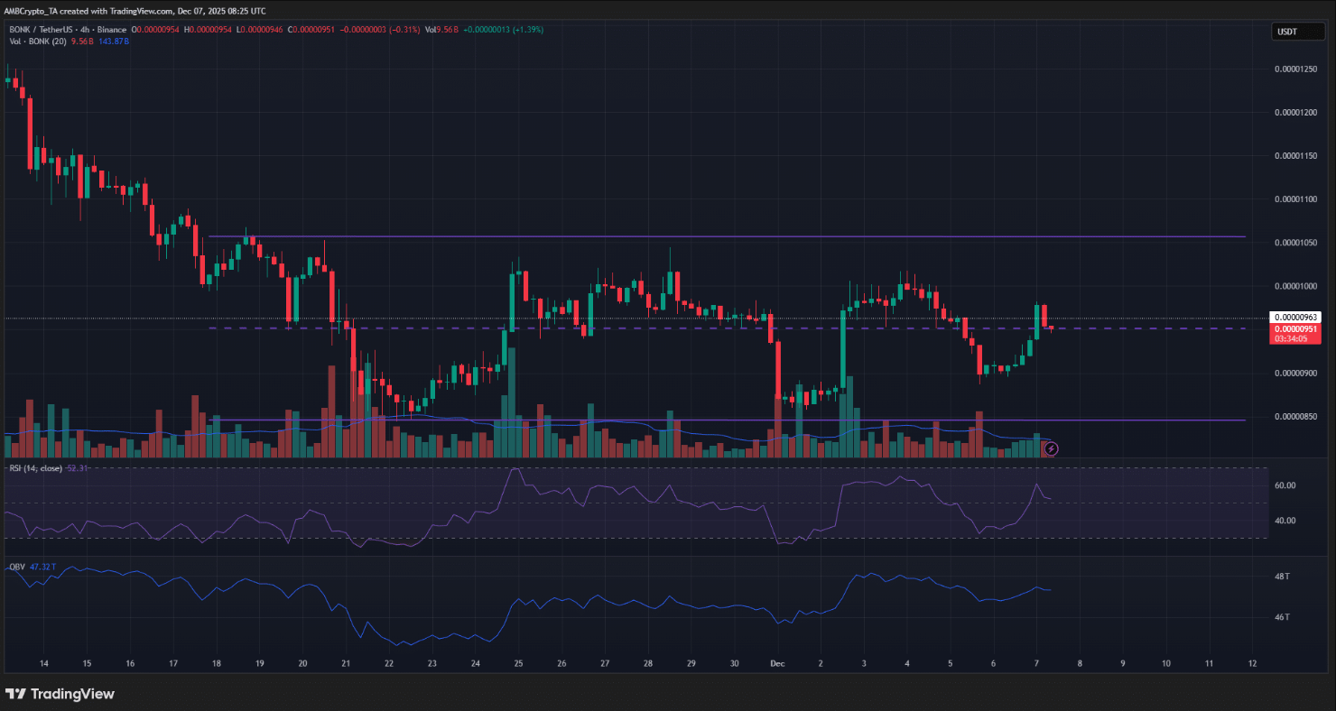 Diễn biến tăng của OBV cho thấy BONK có khả năng đảo chiều xu hướng, dù xác suất chưa thực sự mạnh. Một cú bứt phá dứt khoát lên trên ngưỡng $0,0000105, sau đó kiểm tra lại vùng đỉnh dao động như một mức hỗ trợ mới, sẽ đóng vai trò là tín hiệu mua đáng tin cậy.