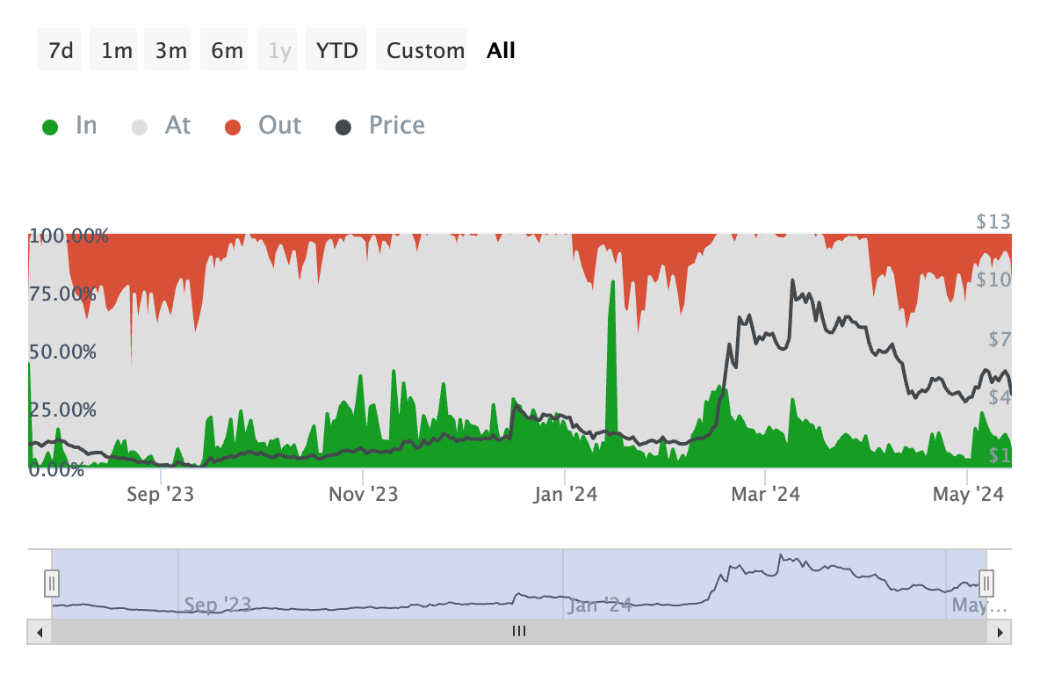 Hãy phân tích lợi nhuận của các địa chỉ hoạt động Worldcoin (WLD) bằng cách sử dụng biểu đồ từ IntoTheBlock, biểu đồ này cung cấp cho chúng ta cái nhìn tổng quan về sức khỏe và tâm lý của thị trường.