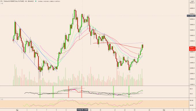 Một trader đã chia sẻ biểu đồ bên dưới. Cho thấy rằng trong khi YFI vẫn thấp hơn nhiều so với mức cao nhất mọi thời đại, nó gần đây đã đảm bảo một đường trung bình động (MA) hàm mũ quan trọng đã giữ ở trên trong đợt tăng trước đó.