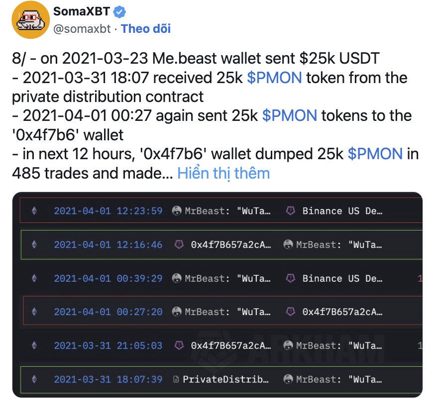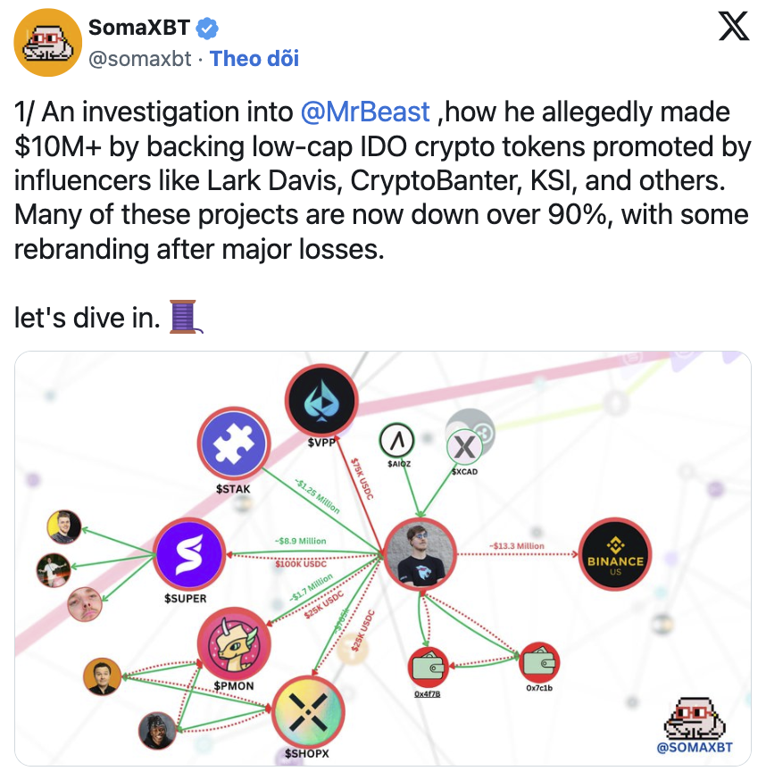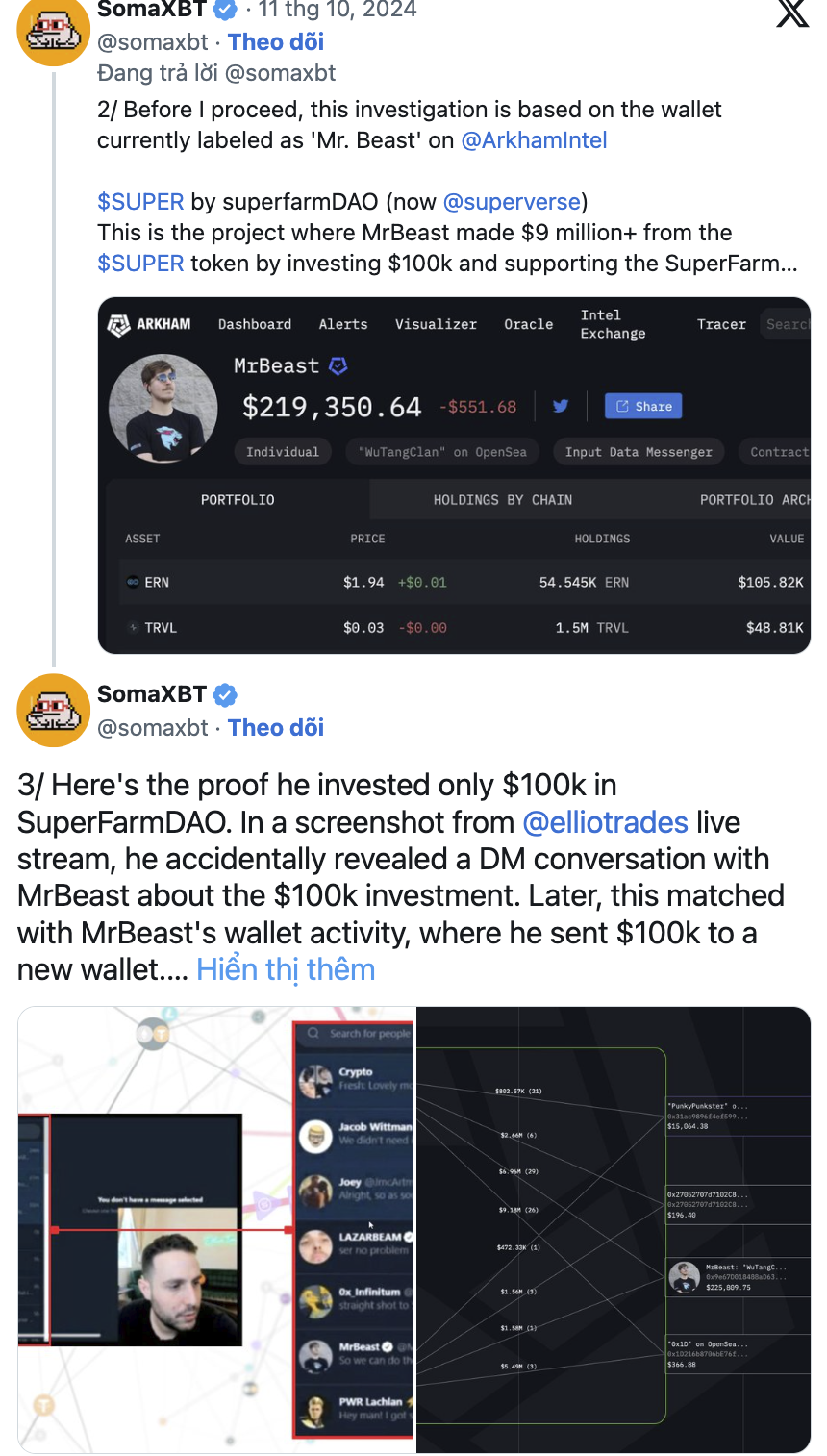 Cuộc điều tra của SomaXBT đã theo dõi các hoạt động bị cáo buộc của MrBeast bằng dữ liệu ví được gán cho anh trên Arkham Intelligence. Thám tử đã chỉ ra nhiều trường hợp trong đó MrBeast đầu tư một số tiền tương đối nhỏ vào các token thông qua giao dịch riêng tư, và sau đó thu về hàng triệu đô la bằng cách bán chúng trong các đợt giao dịch công khai tăng giá.