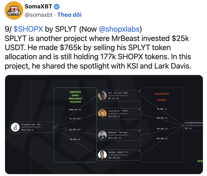 Ngoài ra, MrBeast còn được cho là đã đầu tư 25.000 đô la vào SPLYT (SHOPX), từ đó thu về 765.000 đô la sau khi bán phần phân bổ của mình.