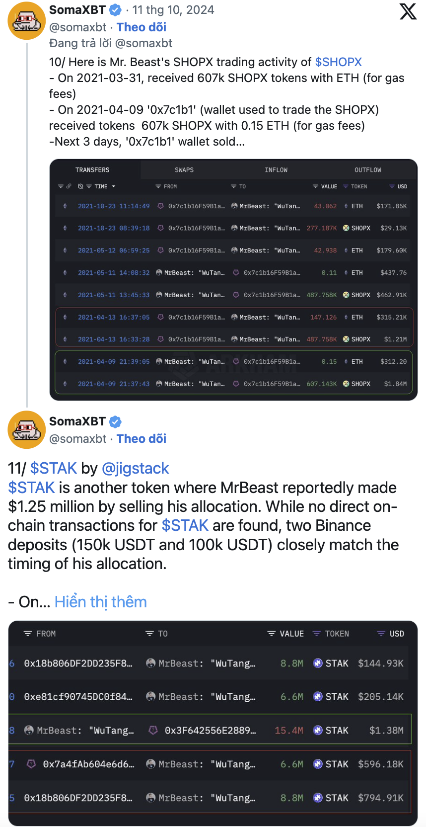 Anh ta cũng đã kiếm được 1,25 triệu đô la từ token STAK, mặc dù thông tin chi tiết về giao dịch này chưa được ghi chép đầy đủ.