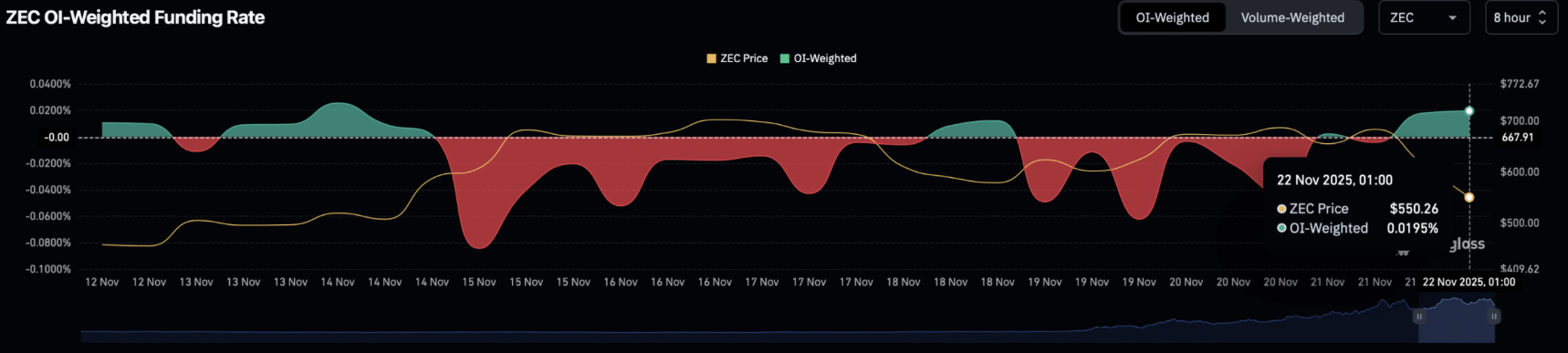 Đáng chú ý, funding rate đã đảo chiều sang dương, lên mức 0,0195%. Đây có thể là tín hiệu cho thấy ZEC đang chuẩn bị bước vào một nhịp phục hồi mới, trong khi đợt điều chỉnh vừa qua nhiều khả năng chỉ là một khoảng nghỉ tạm thời trong xu hướng lớn hơn của thị trường.