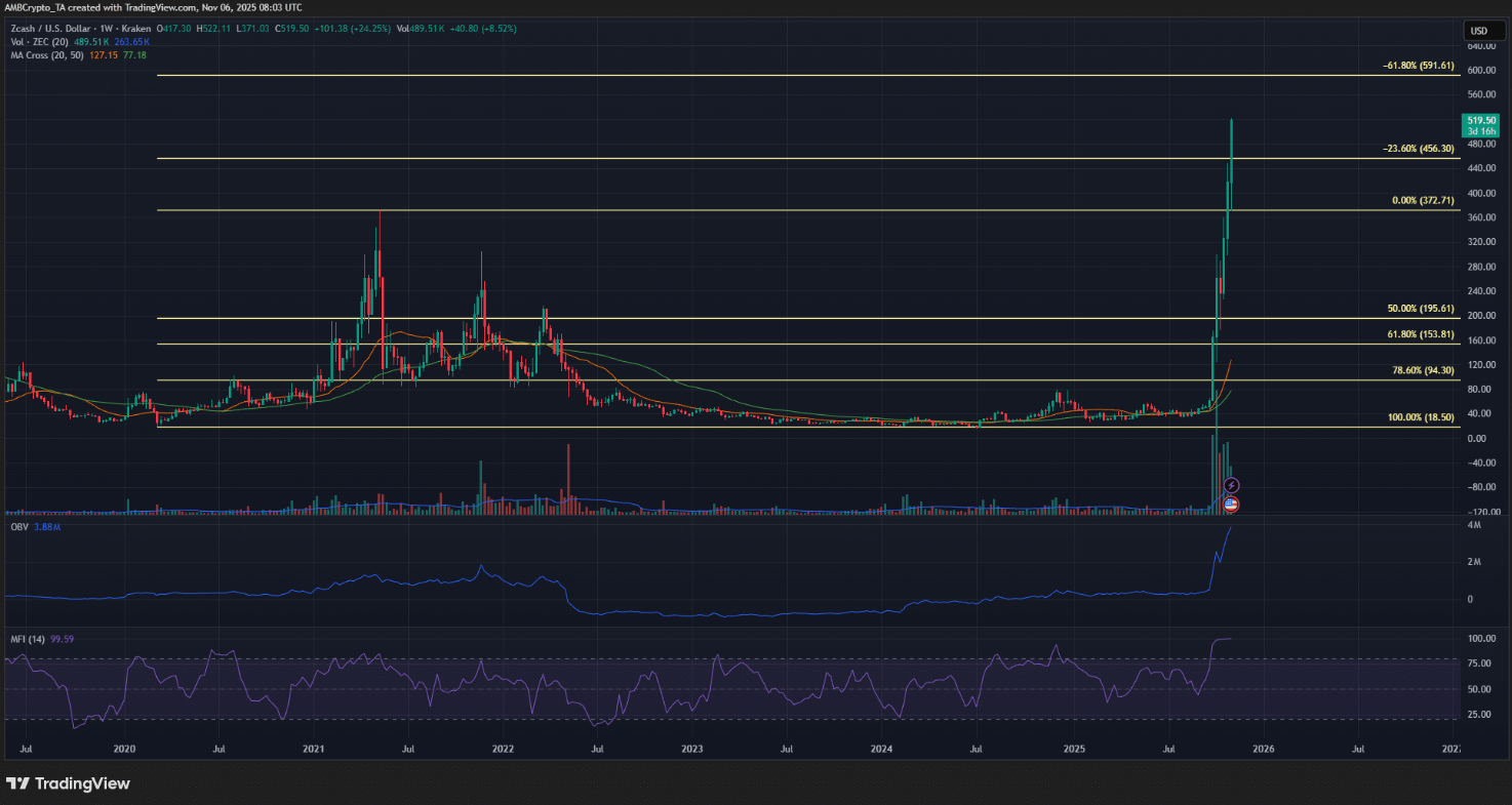 Quan sát trên biểu đồ tuần, có thể thấy rõ mức độ tăng trưởng của ZEC có thể diễn ra nhanh chóng đến mức nào mỗi khi các ngưỡng kháng cự quan trọng bị phá vỡ.