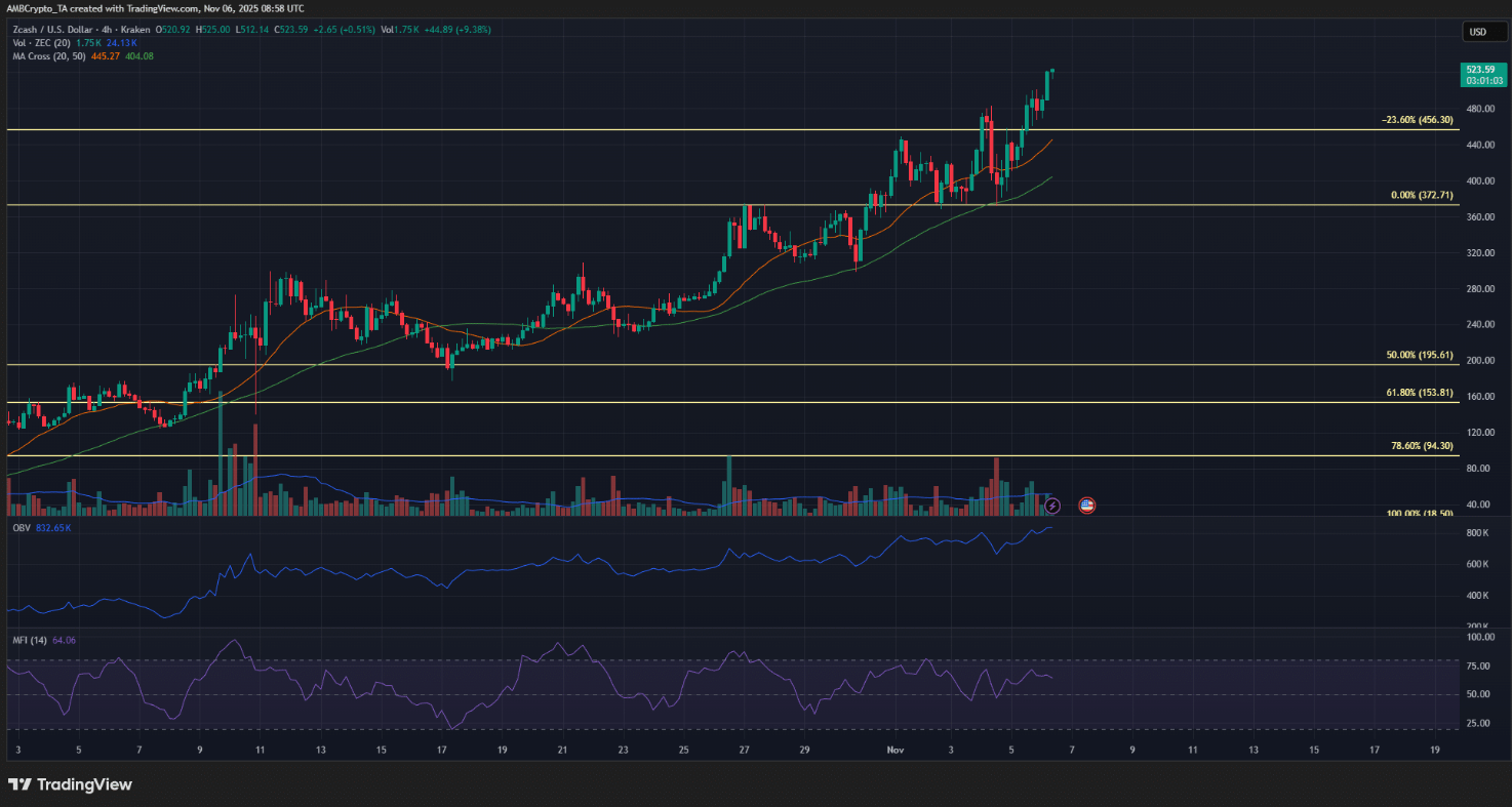 Một ngày trước đó, phe bò đã đẩy giá ZEC lên đỉnh 501 USD trước khi tạm thời lùi bước về vùng 468 USD. Tuy nhiên, nhịp điều chỉnh này diễn ra nhanh chóng và hầu như không đáng kể.