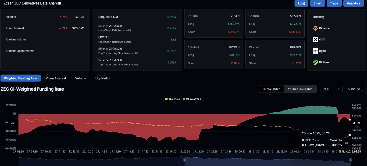 Dữ liệu từ CoinGlass cũng cho thấy hợp đồng mở (OI) của hợp đồng tương lai ZEC giảm 7,71% trong 24 giờ qua, còn 977,39 triệu USD. Sự sụt giảm OI này phản ánh tâm lý thận trọng của các trader, khi họ giảm rủi ro trước khả năng thị trường điều chỉnh hoặc những diễn biến chưa chắc chắn.