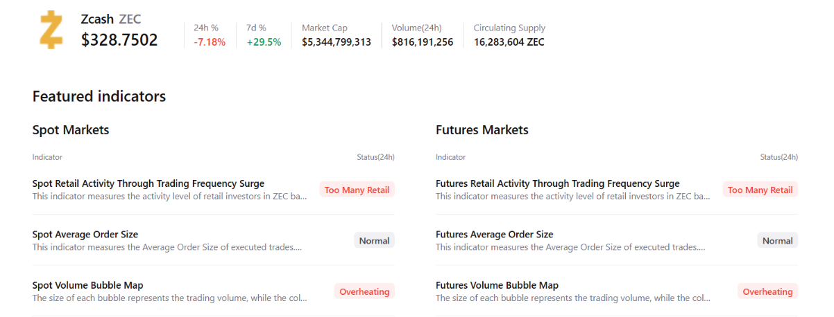 Zcash (ZEC) đang giao dịch trong sắc đỏ dưới mốc 330 USD vào tối thứ Ba, phản ánh sự hạ nhiệt bước đầu sau cú tăng tốc mạnh mẽ hồi đầu tuần. Dữ liệu on-chain cho thấy hoạt động của nhà đầu tư nhỏ lẻ gia tăng đáng kể — một tín hiệu thường gắn liền với việc hình thành đỉnh giá ngắn hạn. Cùng lúc đó, các chỉ báo kỹ thuật liên tục phát đi tín hiệu phân kỳ giảm, cảnh báo động lượng đang yếu dần và rủi ro điều chỉnh trong thời gian tới.