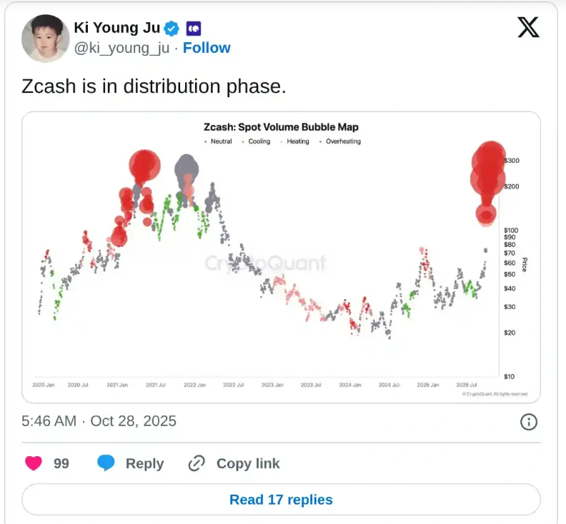Ki Young Ju – Nhà sáng lập kiêm CEO nền tảng dữ liệu on-chain CryptoQuant – nhận định trên X vào ngày thứ Ba rằng Zcash (ZEC) có thể đã bước vào giai đoạn phân phối sau đợt tăng mạnh gần đây.