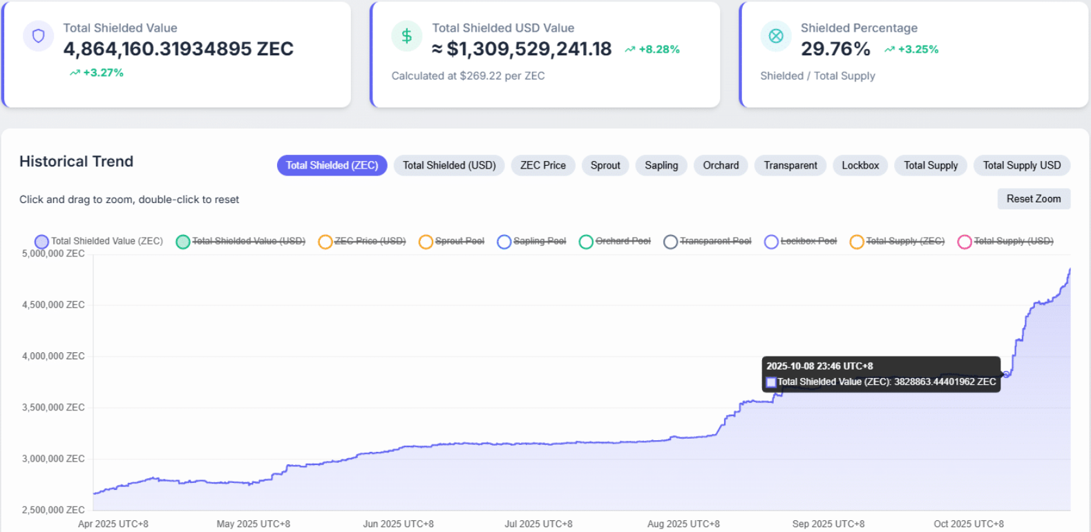 Theo dữ liệu từ zkp.baby, bảng điều khiển thống kê của Zcash, lượng token được “shielded” (ẩn danh hóa) đã đạt 4,864 triệu ZEC, tăng mạnh so với 3,82 triệu ZEC được ghi nhận vào ngày 8/10.