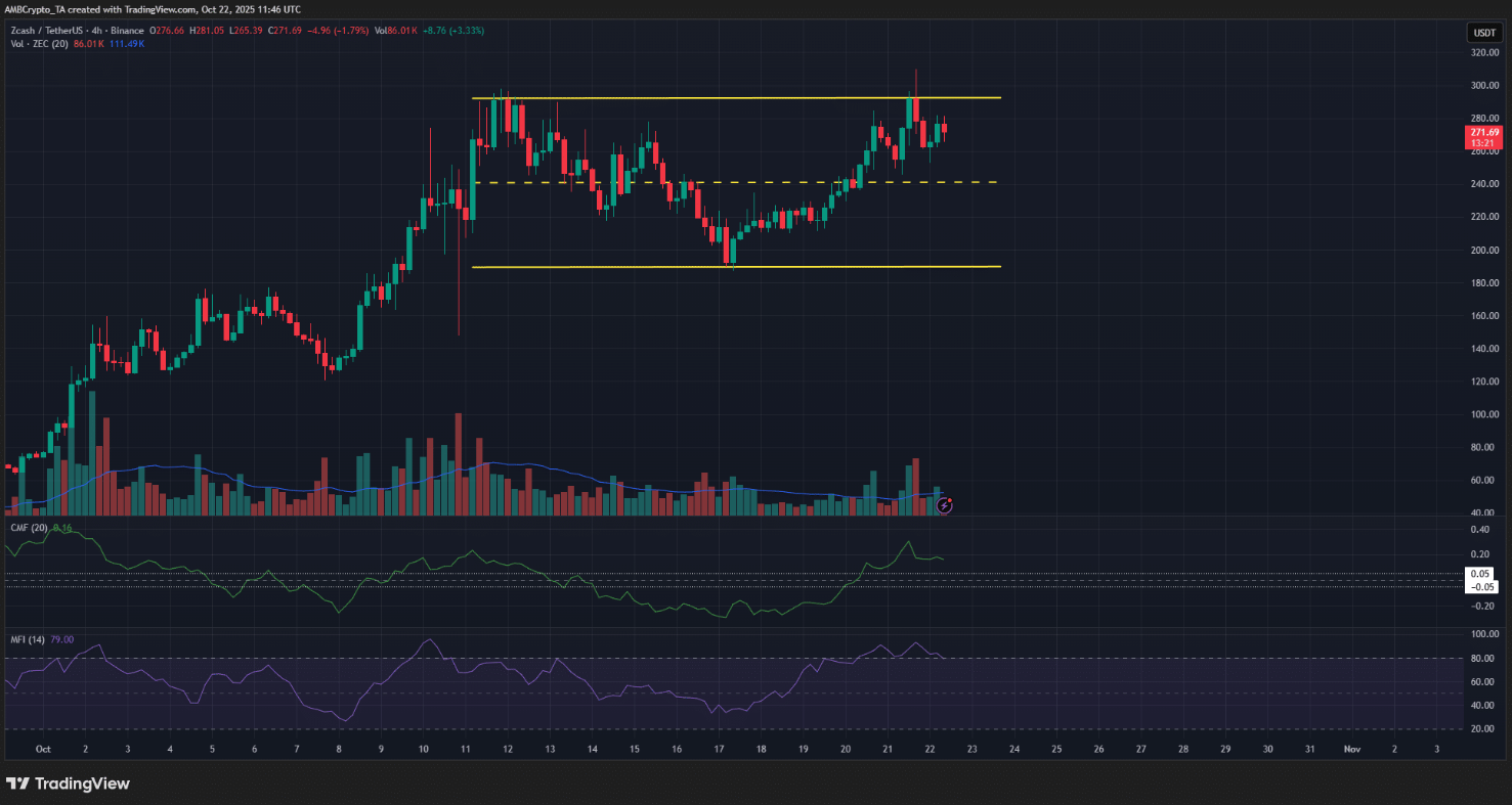 Trên biểu đồ kỹ thuật, ZEC hiện đang dao động trong vùng tích lũy ngắn hạn từ 190 USD đến 292 USD.