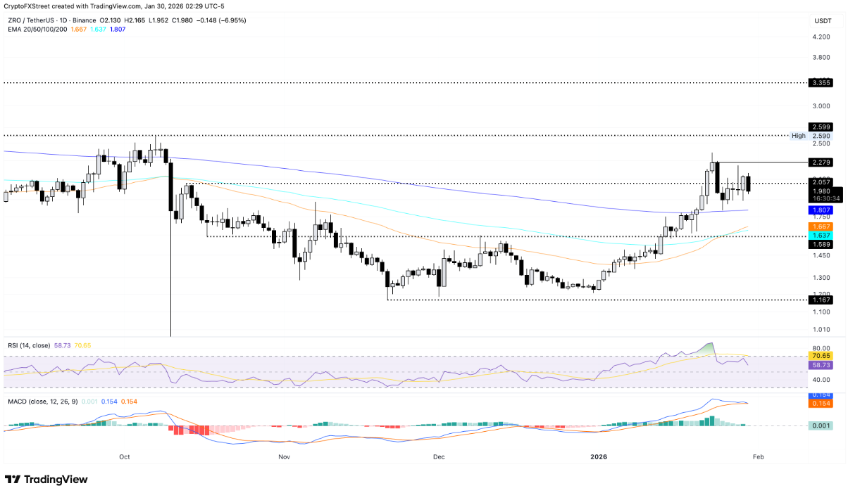 LayerZero giảm 7% tại thời điểm viết bài vào thứ Sáu, nhanh chóng xóa sạch mức tăng 6% ghi nhận trong phiên trước đó. Nhịp điều chỉnh này kéo giá trượt xuống dưới ngưỡng tâm lý 2,00 USD, mở ra dư địa để phe gấu gây áp lực về đường EMA 200 ngày quanh 1,80 USD – tương đương mức giảm khoảng 10% so với hiện tại.
